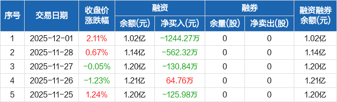 融资方面,当日融资买入952.9万元,融资偿还2197.17万元,融资净偿还1244.27万元,连续3日净偿还累计1937.43万元。融券方面,融券卖出0股,融券偿还0股,融券余量0股,融券余额0元。融资融券余额合计1.02亿元。
