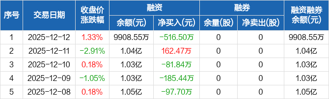 肯特股份:融资净偿还516.5万元,融资余额9908.55万元(12-12)