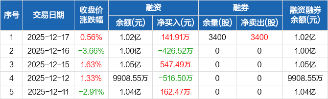 肯特股份:融资净买入141.91万元,融资余额1.02亿元(12-17)
