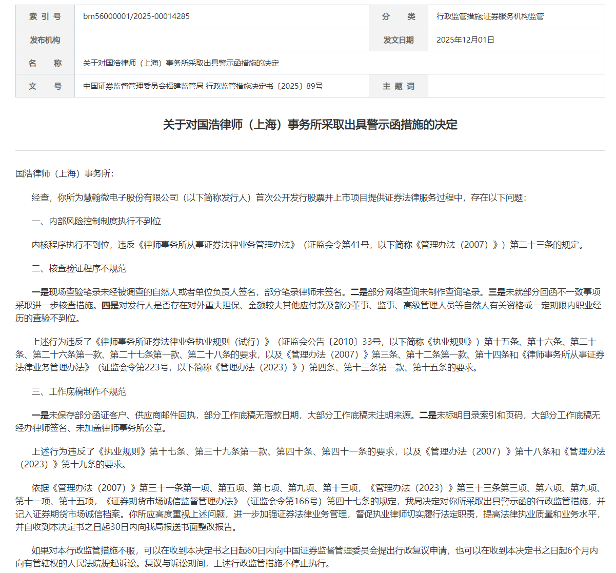 近日,福建证监局发布了一则行政监管措施决定书,剑指国浩律师(上海)事务所。