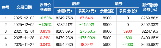 超研股份:融资净买入67.64万元,融资余额8249.75万元(12-03)