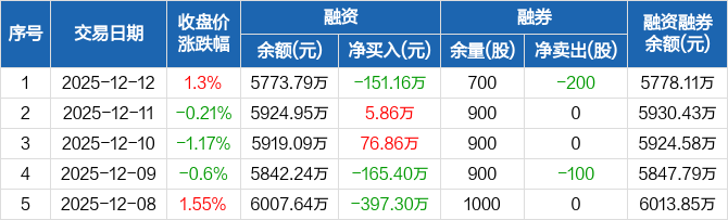 绿联科技:融资净偿还151.16万元,融资余额5773.79万元(12-12)