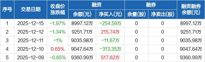 富特科技:融资净偿还254.59万元,融资余额8997.12万元(12-15)