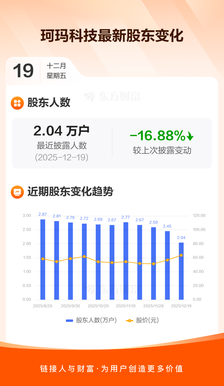 珂玛科技最新披露数据显示,截至12月19日公司股东户数为2.04万户,较上期(2025年12月10日)减少4138户,降幅为16.88%。户均持有流通股数量由上期的5977股上升至7191股,户均持股金额由上期的33.88万元增加至45.71万元。
