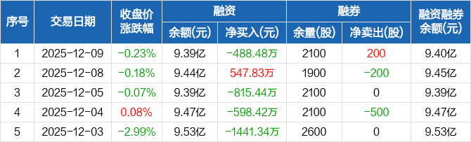 苏州天脉:融资净偿还488.48万元,融资余额9.39亿元(12-09)