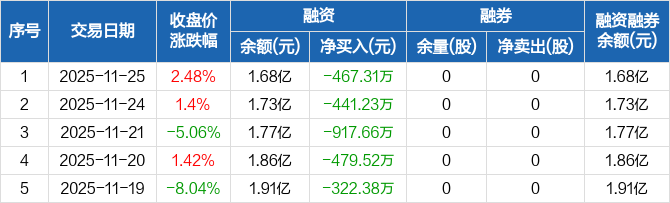 融资方面,当日融资买入1166.74万元,融资偿还1634.05万元,融资净偿还467.31万元,连续7日净偿还累计3253.44万元。融券方面,融券卖出0股,融券偿还0股,融券余量0股,融券余额0元。融资融券余额合计1.68亿元。