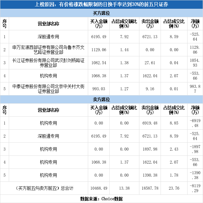 今日龙虎榜单上出现了深股通的身影,占据了买一、卖二的位置,净卖出525.64万元,占当日成交总额的0.67%。