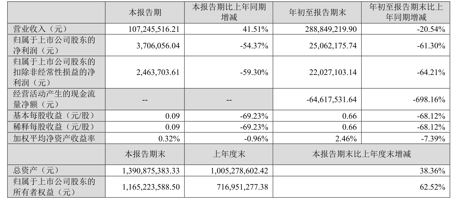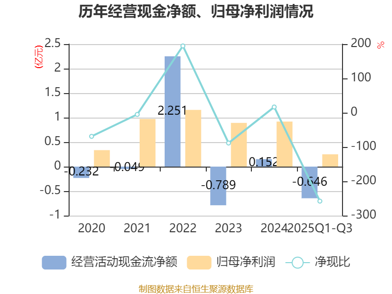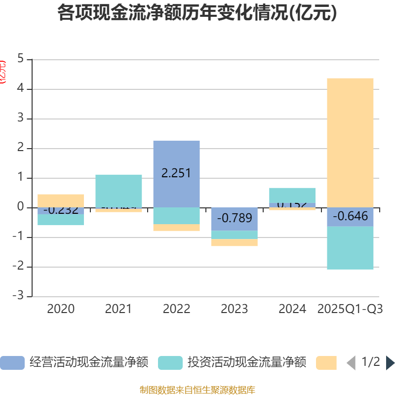 2025年前三季度,公司经营活动现金流净额为-6461.75万元,同比减少7542.03万元;筹资活动现金流净额4.36亿元,同比增加4.42亿元;投资活动现金流净额-1.45亿元,上年同期为-8044.8万元。
