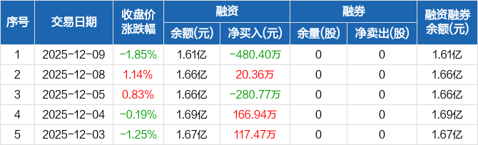 同宇新材:融资净偿还480.4万元,融资余额1.61亿元(12-09)