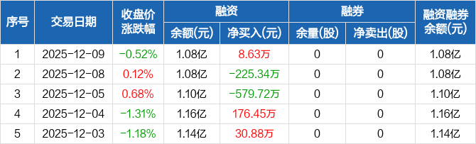 融资方面,当日融资买入246.48万元,融资偿还237.86万元,融资净买入8.63万元。融券方面,融券卖出0股,融券偿还0股,融券余量0股,融券余额0元。融资融券余额合计1.08亿元。