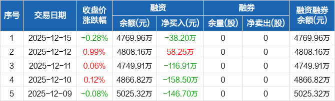 泽润新能:融资净偿还38.2万元,融资余额4769.96万元(12-15)
