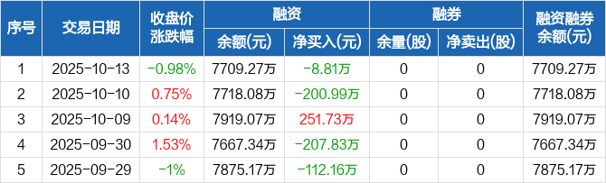 泰禾股份:融资净偿还8.81万元,融资余额7709.27万元(10-13)