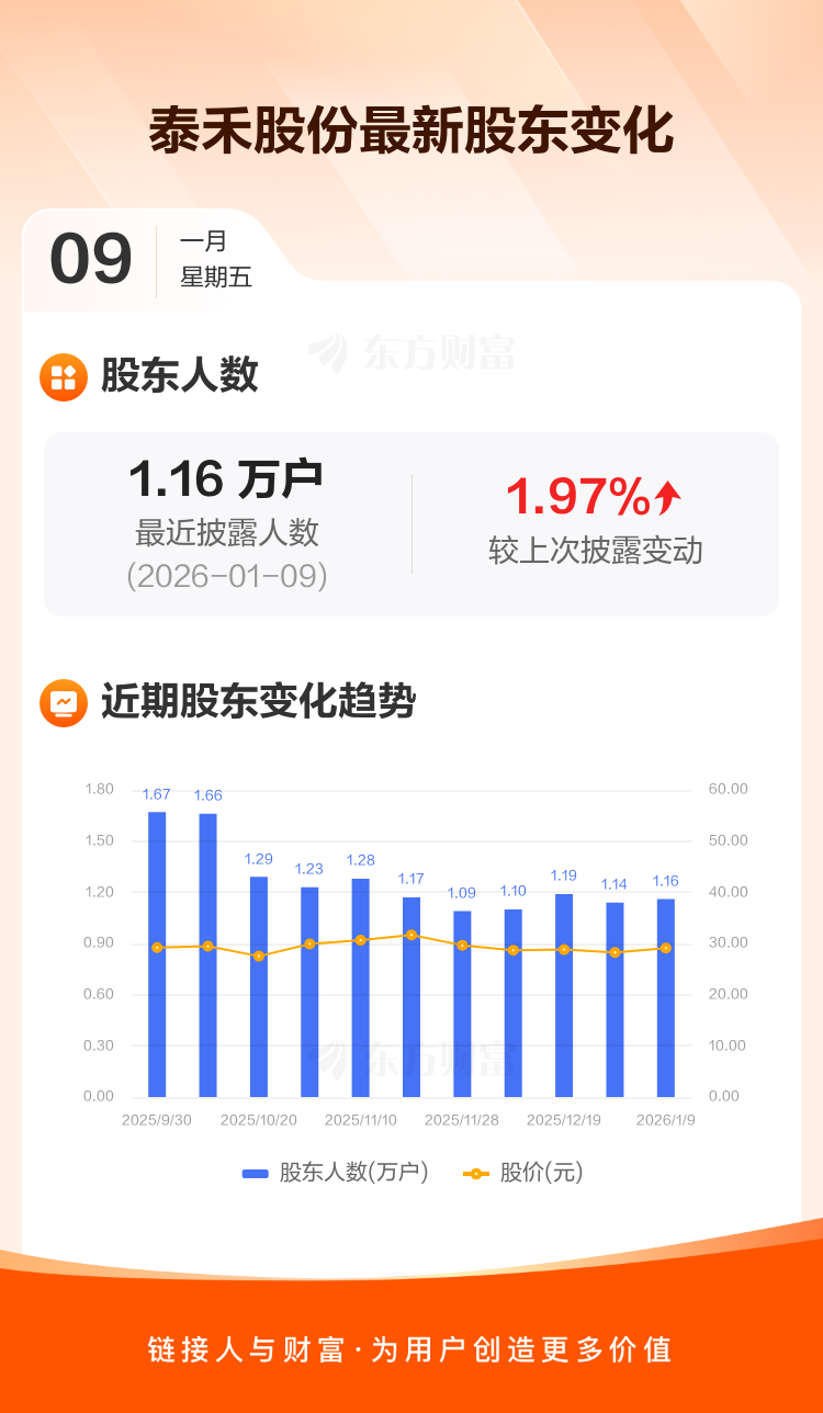 泰禾股份最新披露数据显示,截至1月9日公司股东户数为1.16万户,较上期(2025年12月31日)增加225户,增幅为1.97%。户均持有流通股数量由上期的3353股下降至3288股,户均持股金额由上期的9.47万元增加至9.57万元。