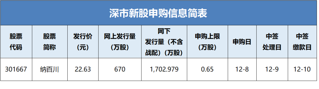 2025年12月8日,纳百川新能源股份有限公司(简称:纳百川)将通过深交所网下发行电子平台和交易系统发行新股,具体信息如下。