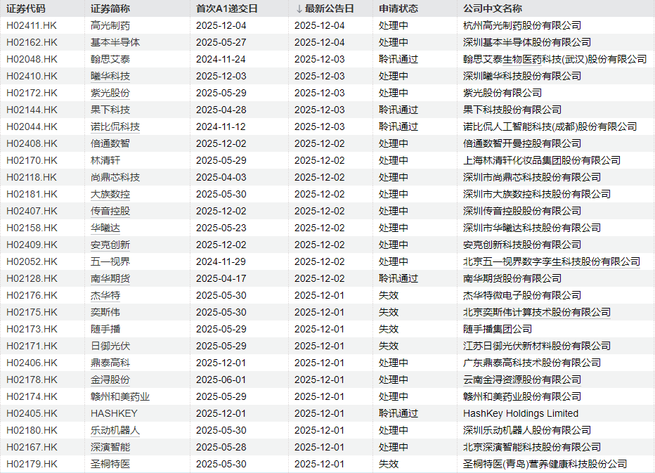 其中,杭州高光制药股份有限公司、深圳曦华科技股份有限公司、倍通数智开曼控股有限公司、深圳传音控股股份有限公司、安克创新科技股份有限公司、广东鼎泰高科技术股份有限公司等6家公司为首次递交。