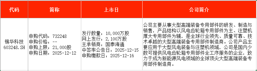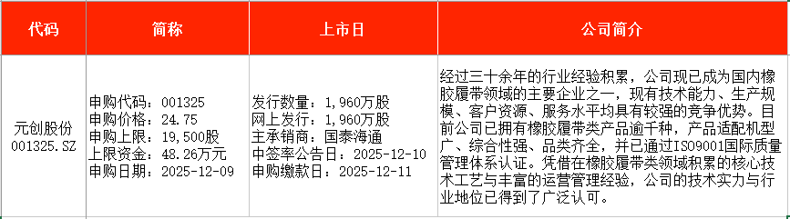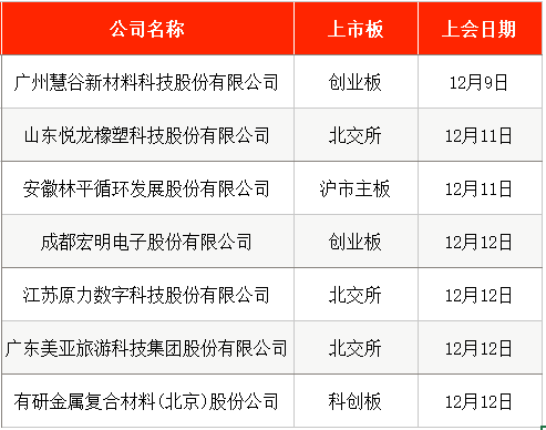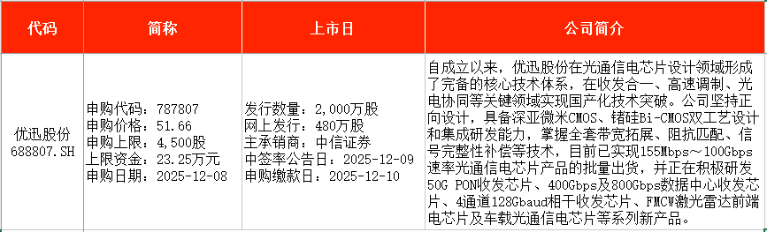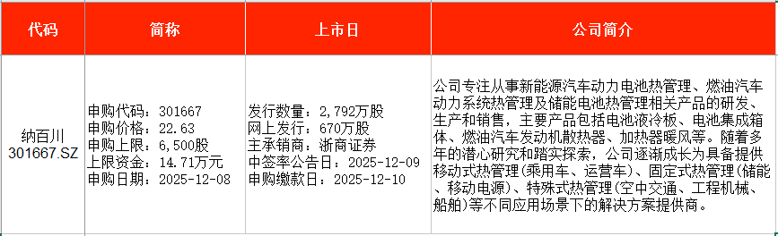 从时间表看,纳百川(301667)、优讯股份(688807)将在本周一(12月8日)申购;元创股份(001325)将在本周二(12月9日)申购;天溯计量(301449)、锡华科技(603248)均在本周五(12月12日)申购。