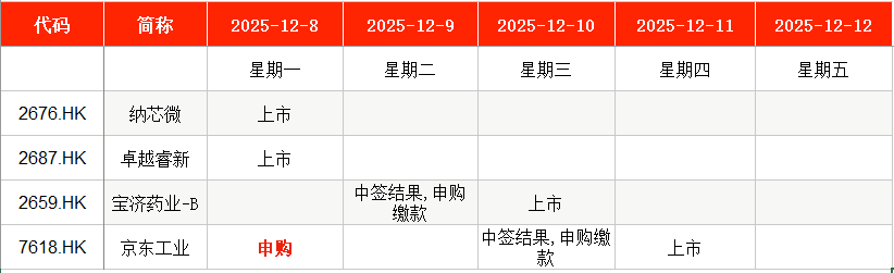 港股方面,Wind数据显示,本周(12月8日至12月12日)京东工业(07618.HK)将在周一(12月8日)申购。