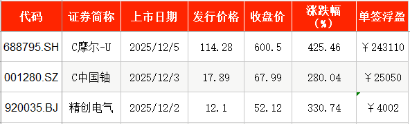值得一提的是,上周上市的3只新股首日涨幅均超过280%。其中,12月5日在科创板正式挂牌上市的摩尔线程,首日涨幅为425.46%。以收盘价计算,投资者中一签浮盈高达24.31万元。