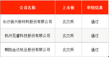 其中,拟在北交所IPO的长沙族兴新材料股份有限公司(下称“族兴新材”)、杭州觅睿科技股份有限公司(下称“觅睿科技”)、朝阳金达钛业股份有限公司(下称“金钛股份”)等3家公司,均成功过会。