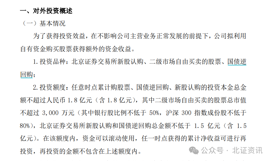 公告称,投资额度为任意时点累计的投资本金总金额不超过1.8亿元,其中二级市场自由买卖的股票总市值不超过3000万元(银行股比例不低于50%,沪深300指数成份股不低于80%),北交所新股认购和国债逆回购总金额不低于1.5亿元。在该额度内,资金可以滚动使用,任一时点获得的累计净收益可进行再投资,再投资的金额不包含在上述额度内。