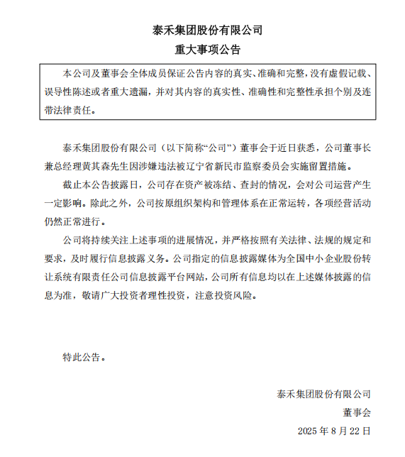 8月22日,泰禾集团股份有限公司公告,董事会于近日获悉,公司董事长兼总经理黄其森因涉嫌违法被辽宁省新民市监察委员会实施留置措施。截至本公告披露日,公司存在资产被冻结、查封的情况,会对公司运营产生一定影响。除此之外,公司按原组织架构和管理体系在正常运转,各项经营活动仍然正常进行。