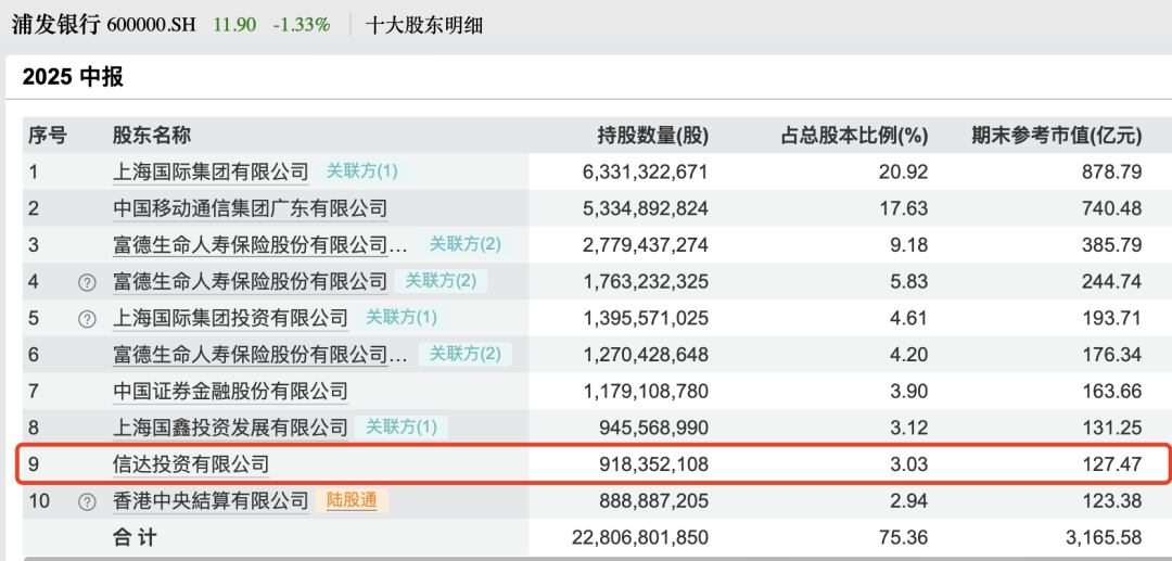 根据浦发银行半年报,上海国际集团及其一致行动人合计持股29.09%,位列第一大股东;富德生命人寿、中国移动广东公司分别持股20.04%、17.63%;中证金融公司持股3.9%;信达资产旗下的信达投资持股3.03%。