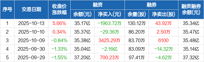 浦发银行融资融券信息显示,2025年10月13日融资净偿还1963.72万元;融资余额35.17亿元,较前一日下降0.56%。