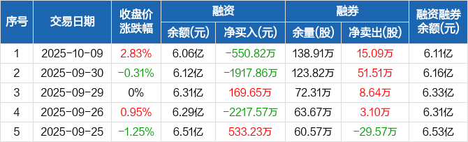 融资方面,当日融资买入4490.37万元,融资偿还5041.19万元,融资净偿还550.82万元。融券方面,融券卖出19.39万股,融券偿还4.3万股,融券余量138.91万股,融券余额454.24万元。融资融券余额合计6.11亿元。