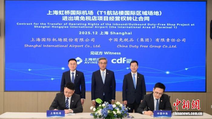 上海机场签约代表与中国中免签约代表签署虹桥国际机场(T1)免税店项目经营权转让合同。上海机场集团供图