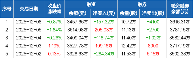 皖通高速融资融券信息显示,2025年12月8日融资净偿还157.32万元;融资余额3457.66万元,较前一日下降4.35%。