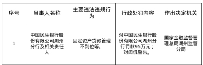 民生银行湖州分行被罚95万,涉固定资产贷款管理不到位等