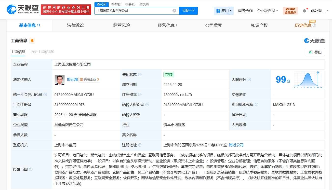 南方财经11月20日电,天眼查工商信息显示,11月20日,上海国茂控股有限公司成立,法定代表人为郑元湖,注册资本130亿人民币,经营范围含港口经营、燃气经营、以自有资金从事投资活动、创业投资、投资管理、企业总部管理、信息咨询服务、贸易经纪、货物进出口、技术进出口等。股东信息显示,该公司由上港集团(600018)、上海国际信托有限公司、上海汽车工业(集团)有限公司、上海国际集团有限公司等共同持股。据媒体报道,近日,上港集团发布公告,宣布携手上海国际集团及其他多家上海市属国资企业,共同投资设立上海国茂控股有限公司。此前,上海市政府印发《关于同意组建上海国茂控股有限公司的批复》。