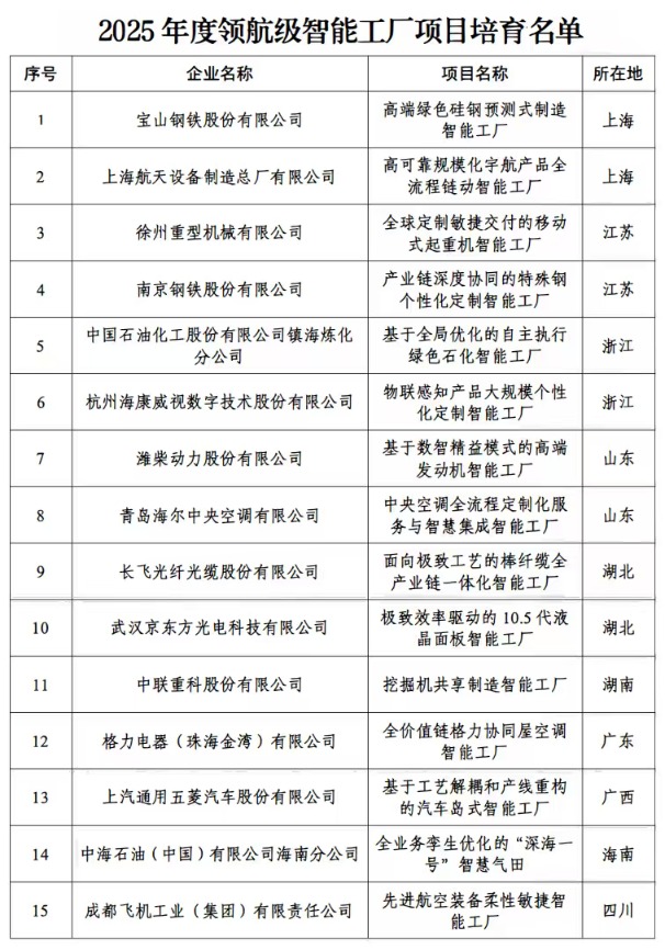 涵盖装备制造等关键行业 我国首批15家领航级智能工厂名单公布