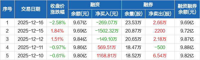 融资方面,当日融资买入3174.46万元,融资偿还3443.53万元,融资净偿还269.07万元,连续3日净偿还累计1920.49万元。融券方面,融券卖出3.78万股,融券偿还1.12万股,融券余量23.53万股,融券余额266.36万元。融资融券余额合计9.69亿元。