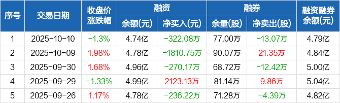 融资方面,当日融资买入2714.09万元,融资偿还3036.17万元,融资净偿还322.08万元,连续3日净偿还累计2403万元。融券方面,融券卖出5.1万股,融券偿还18.17万股,融券余量77万股,融券余额468.93万元。融资融券余额合计4.79亿元。