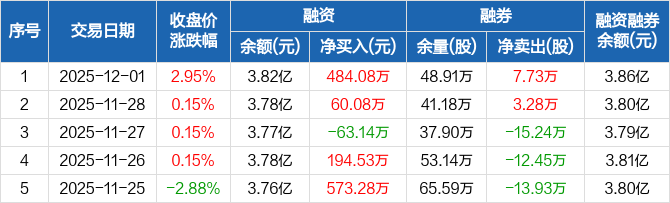 融资方面,当日融资买入2312.81万元,融资偿还1828.73万元,融资净买入484.08万元。融券方面,融券卖出9.3万股,融券偿还1.57万股,融券余量48.91万股,融券余额341.39万元。融资融券余额合计3.86亿元。