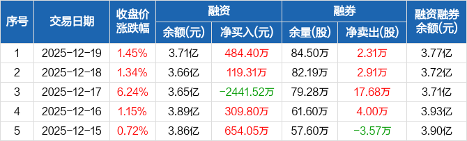 融资方面,当日融资买入3097.87万元,融资偿还2613.47万元,融资净买入484.4万元。融券方面,融券卖出3.76万股,融券偿还1.45万股,融券余量84.5万股,融券余额650.65万元。融资融券余额合计3.77亿元。