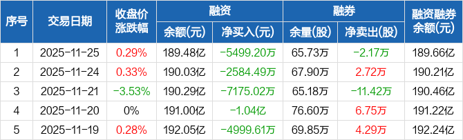 中信证券融资融券信息显示,2025年11月25日融资净偿还5499.2万元;融资余额189.48亿元,较前一日下降0.29%。