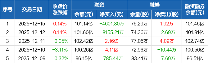 招商银行:融资净偿还4601.8万元,融资余额101.14亿元(12-15)