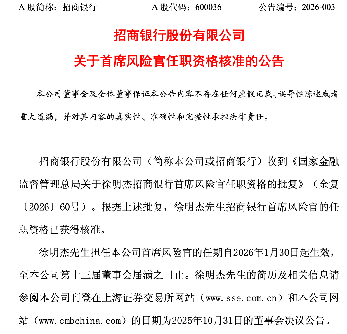 上证报中国证券网讯(记者徐潇潇)2月2日,招商银行发布公告称,该行收到《国家金融监督管理总局关于徐明杰招商银行首席风险官任职资格的批复》(金复〔2026〕60号)。根据上述批复,徐明杰招商银行首席风险官的任职资格已获得核准,任期自2026年1月30日起生效,至招商银行第十三届董事会届满之日止。