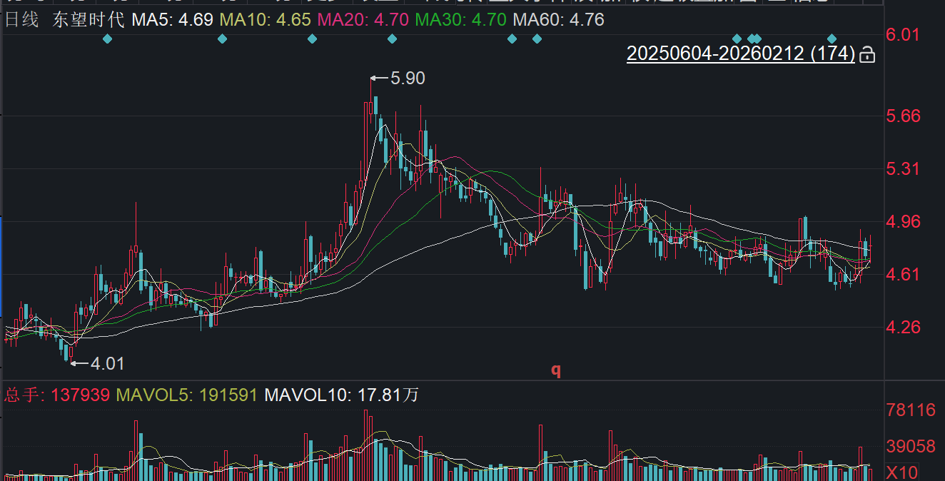 二级市场上,截至2月12日10点20分,东望时代上涨1.69%报4.80元/股,总市值约40.52亿元,近一年来公司股价近乎“原地踏步”。