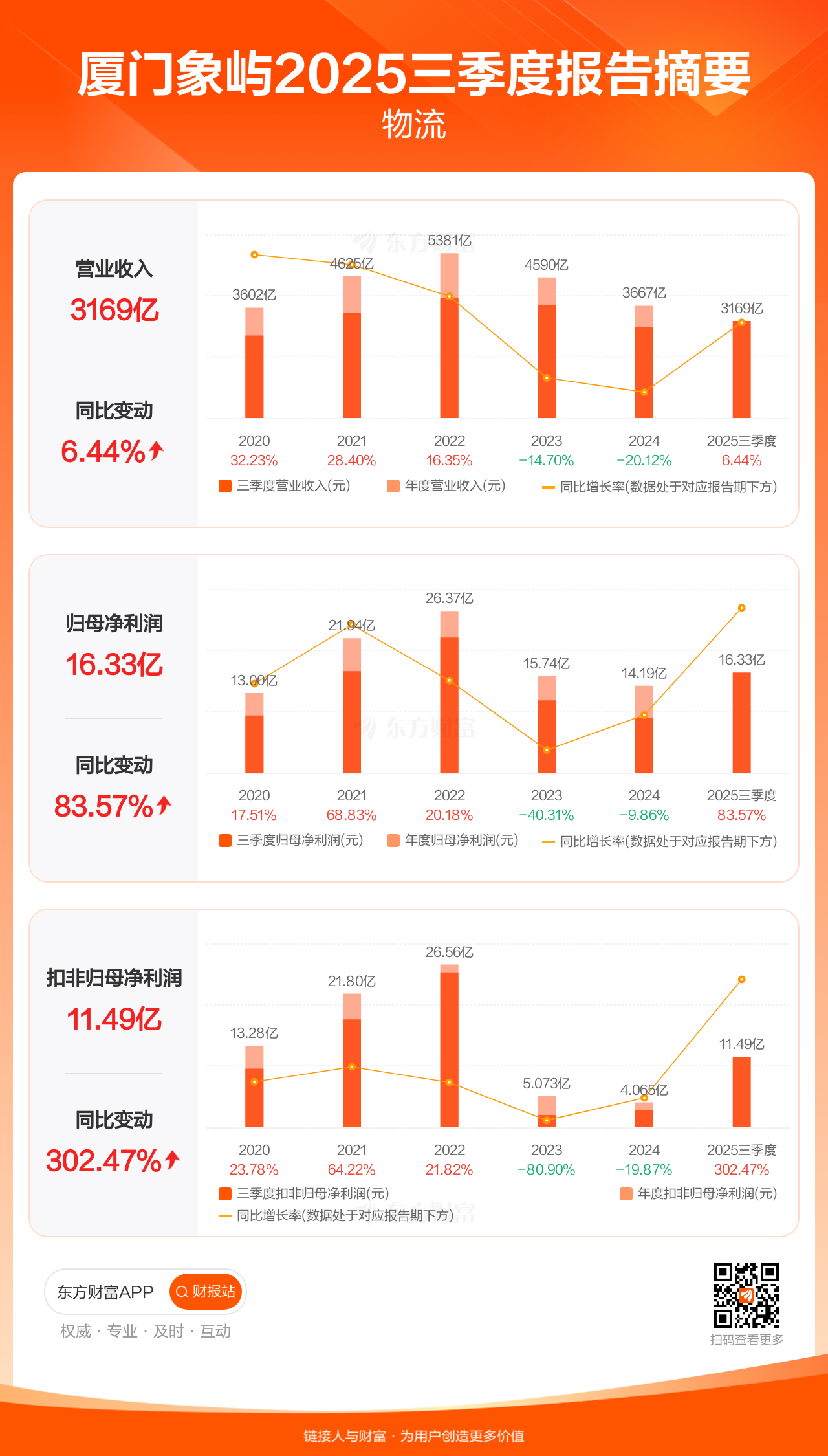 厦门象屿10月30日发布2025年三季报显示,公司前三季实现营业收入3168.65亿元,同比增长6.44%;归母净利润16.33亿元,同比增长83.57%;扣非归母净利润11.49亿元,同比增长302.47%。