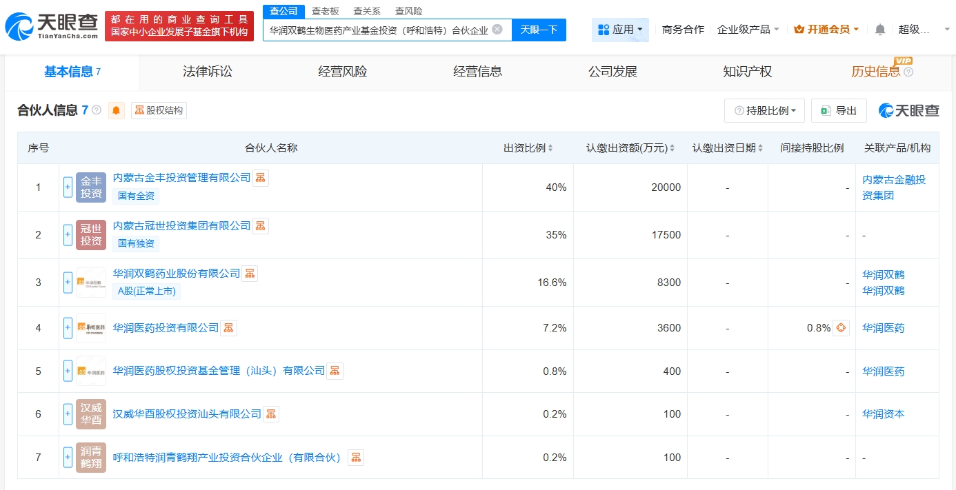 每经AI快讯,天眼查工商信息显示,近日,华润双鹤生物医药产业基金投资(呼和浩特)合伙企业(有限合伙)成立,执行事务合伙人为华润医药股权投资基金管理(汕头)有限公司、汉威华酉股权投资汕头有限公司,出资额5亿元人民币,经营范围包括以私募基金从事股权投资、投资管理、资产管理等活动。合伙人信息显示,该基金由内蒙古金丰投资管理有限公司、内蒙古冠世投资集团有限公司、华润双鹤(600062)等共同出资。