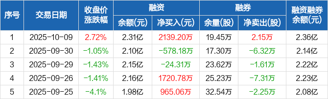 宇通客车融资融券信息显示,2025年10月9日融资净买入2139.2万元;融资余额2.31亿元,较前一日增加10.2%。