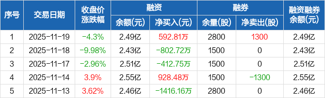 融资方面,当日融资买入3452.83万元,融资偿还2860.02万元,融资净买入592.81万元。融券方面,融券卖出1300股,融券偿还0股,融券余量2800股,融券余额1.18万元。融资融券余额合计2.49亿元。