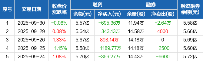 中船科技:融资净偿还695.36万元,融资余额5.57亿元(09-30)