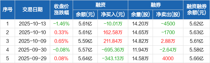 中船科技:融资净偿还10.01万元,融资余额5.61亿元(10-13)