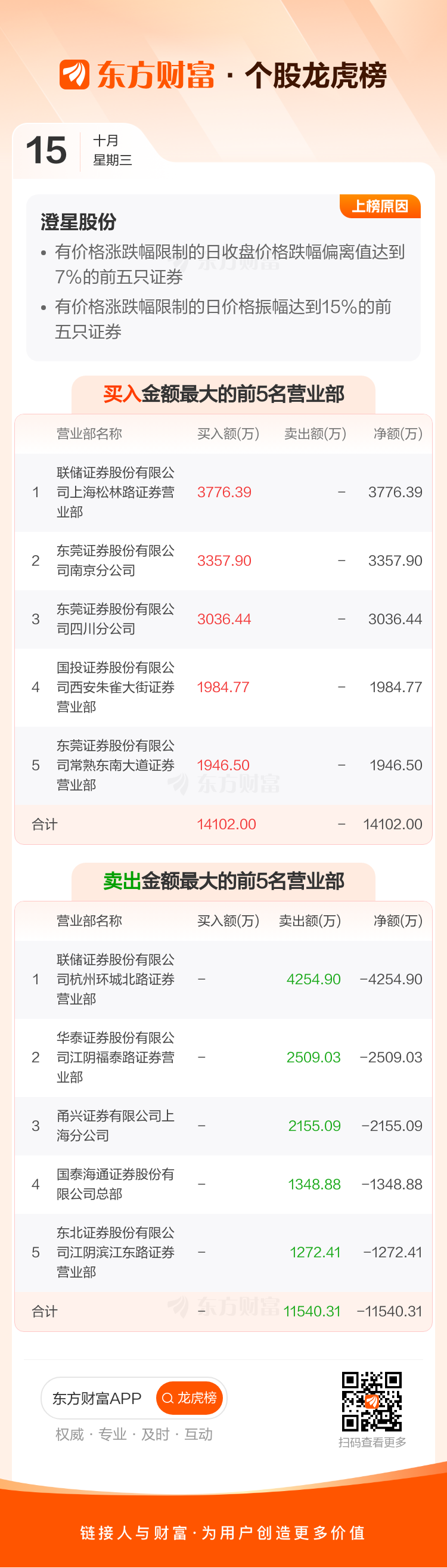 交易所2025年10月15日公布的交易公开信息显示,澄星股份因成为有价格涨跌幅限制的日收盘价格跌幅偏离值达到7%的前五只证券、有价格涨跌幅限制的日价格振幅达到15%的前五只证券上榜。澄星股份当日收报8.96元,涨跌幅-9.68%,偏离值-10.89%,换手率20.97%,成交额13.83亿。