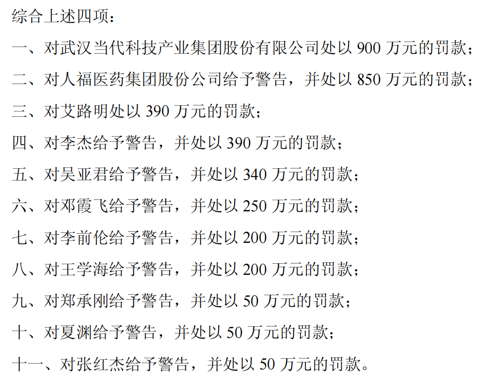 综合上述多项违法违规行为,湖北证监局决定,对当代集团处以900万元的罚款,对人福医药给予警告,并处以850万元的罚款。