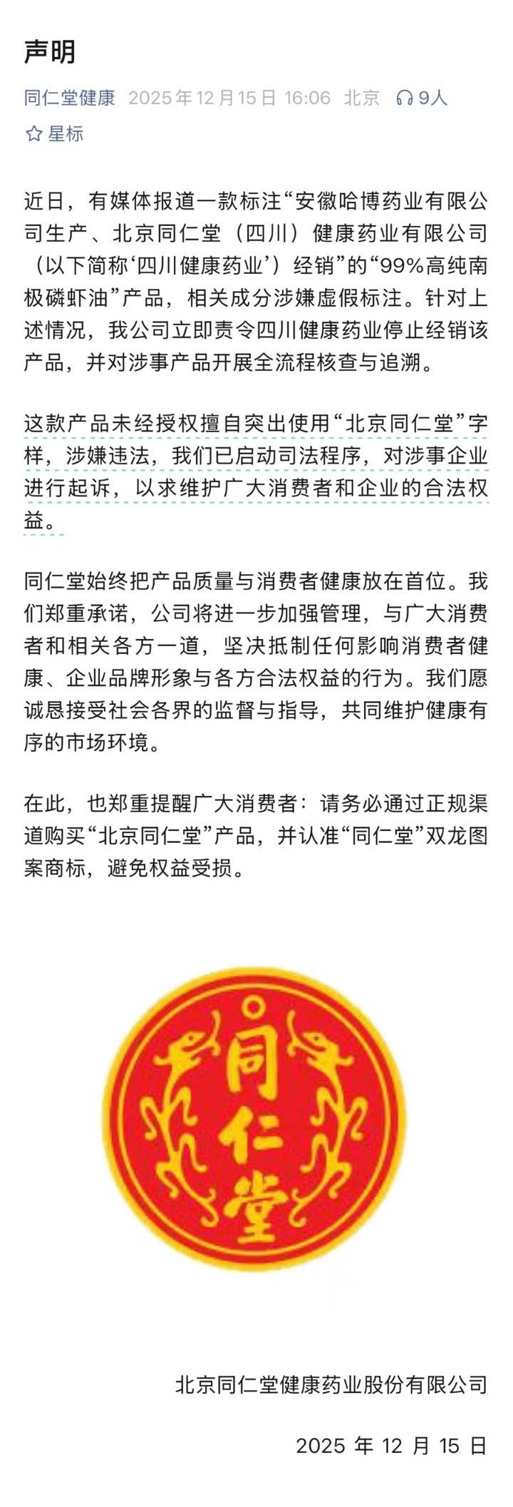 北京同仁堂健康药业股份有限公司通过官方服务号“同仁堂健康”表示:一款标注“安徽哈博药业有限公司生产、北京同仁堂(四川)健康药业有限公司(以下简称‘四川健康药业’)经销”的“99%高纯南极磷虾油”产品,相关成分被曝涉嫌虚假标注。针对上述情况,公司立即责令四川健康药业停止经销该产品,并对涉事产品开展全流程核查与追溯。